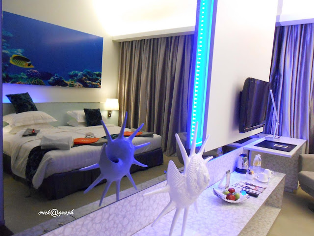 mendapatkan kamar dengan tema unsur air, semua yang ada di dalam ruangan itu berwarna